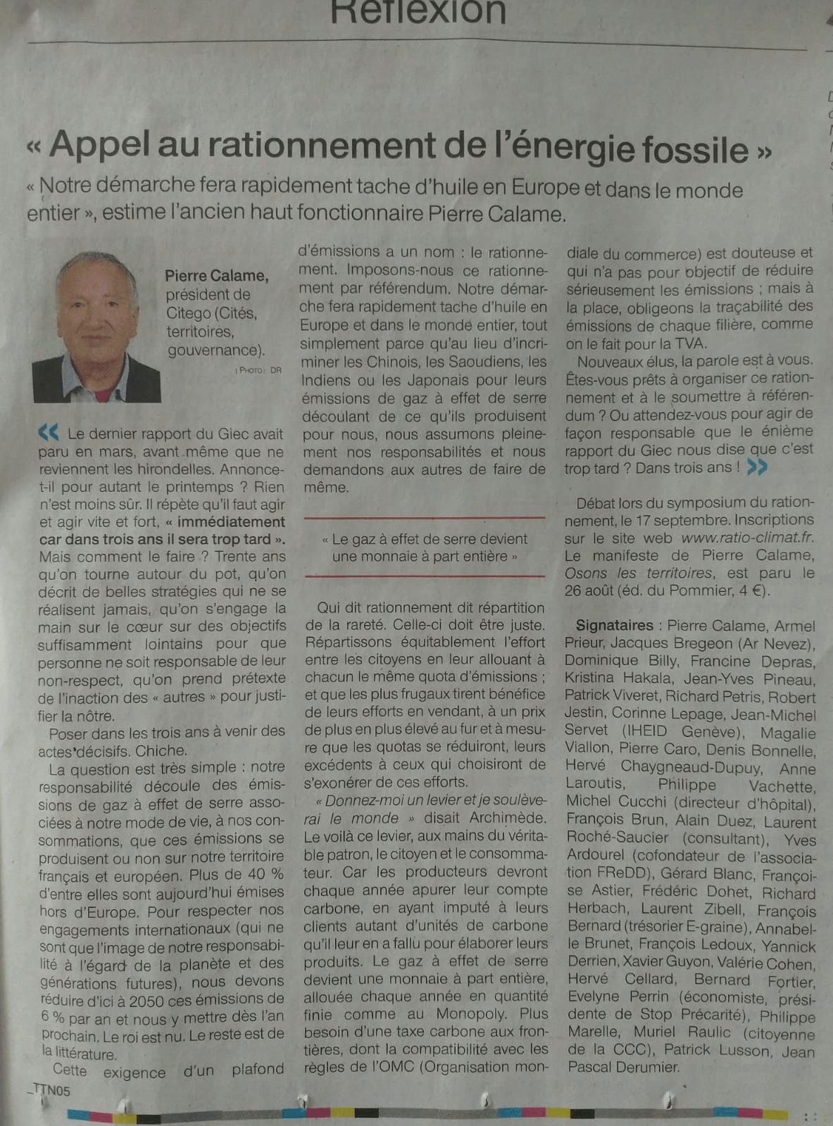 Diffusion le 29 aout 2022 d'une tribune pour le rationnement fossile :