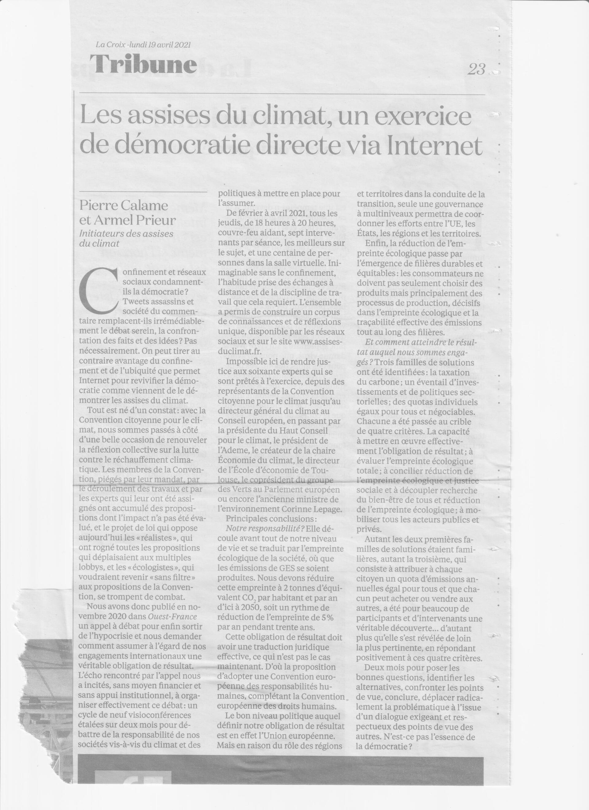 Kaunis tribüüniPierre Calame 26. kesäkuuta 2020 kiittääkseen CCC:n kansalaisia, jotka olivat jossain määrin hyvän tarkoituksen uhreja (saa heidät työskentelemään viidessä ryhmässä tehokkuuden lisäämiseksi, mikä tuotti joukon myötätuntoisia toimenpiteitä "maailmanlaajuisen ehdotuksen" sijaan), hän pohtii, mikä voisi olla ilmastokansanäänestys, jossa sosiaalinen polku on yksilöllisten kiintiöiden jakaminen...
