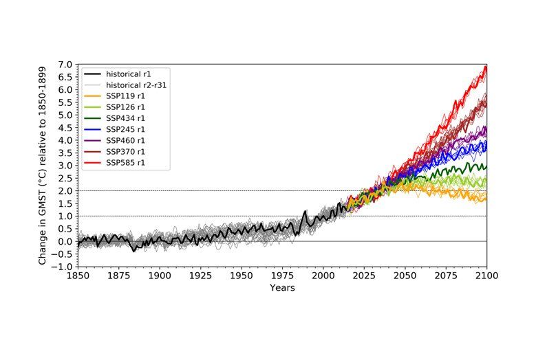 O cenário SSP1-1.9 (o da conta de carbono) mostra um retorno à concentração de 2000 a partir de 2150, tendo passado por mais de 500 ppm por volta de 2040.